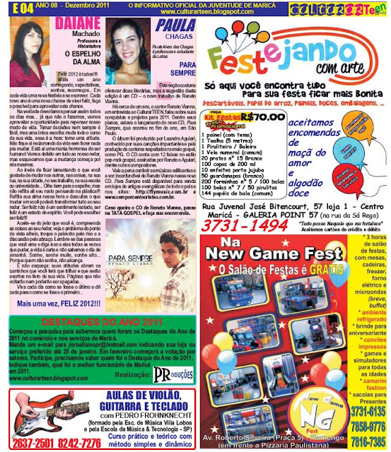CULTURARTEEN 104 - abril de 2012 Confira nesta edição do CULTURARTEEN: - Excelentes dicas para a páscoa - Juliana Santini, a jovem empresária 4 anos depois de inaugurar o CULTURARTEEN ON LINE - Aila Brandão, os jovens mudando os rumos de Maricá - Muitas promoções para você - As maravilhas do café - Os cuidados com a carambola - O Pixel - Jéssica Jabor no Som Gospel 2012 - Destaques do Ano 2011 - A formatura da Becs Roses Model - Concurso Top Fashion Fotogenia - As vencedoras do Gata Verão 2012 tudo isso e muito mais na edição de abril do seu CULTURARTEEN